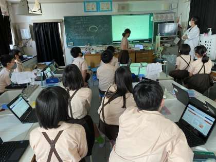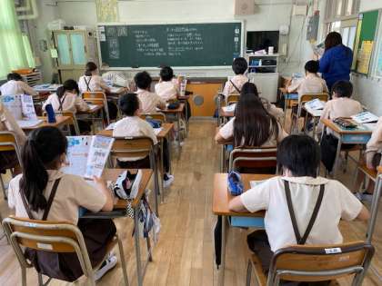 6年生1・2組の授業のようすです。1組は理科で、「消化」について調べたことを発表しています。2組は社会で、「震災の復興」について学習しています。