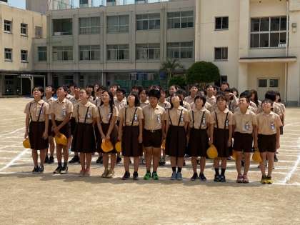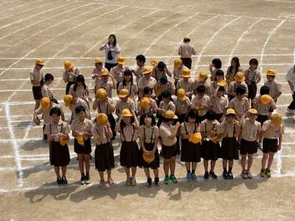本日2時間目、100周年記念事業として、全校児童による集合写真を撮りました。西校舎の3階から運動場に並んだ児童を撮影してもらいました。