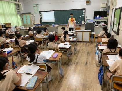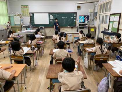 2年生1・2組の授業のようすです。どちらも国語で、「名前を 見て ちょうだい」をみんなで音読したりしています。