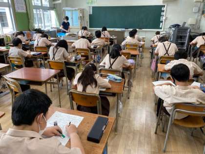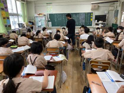 5年生1・2組の授業のようすです。1組は国語で、「世界でいちばんやかましい音」の内容について、深く読み取ろうとしています。2組は算数で、「小数のわり算」のプリントに取り組んでいます。