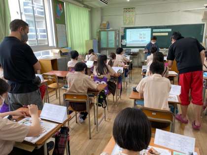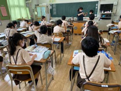 6年生1・2組の授業のようすです。1組は英語で、「見たいスポーツをたずね合おう」ということで、「Do you want to watch 〜 ?」「Yes.I do./No.I don't」という英文を練習しています。2組は社会で、縄文式土器と弥生式土器の違いについて学習しています。