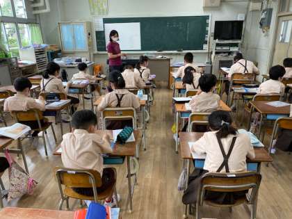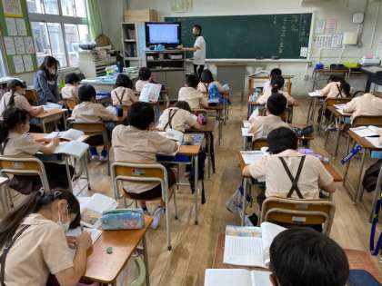 3年生1・2組の授業のようすです。どちらも国語で、「はりねずみと金貨」のあらすじをノートに書いたりしています。