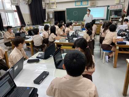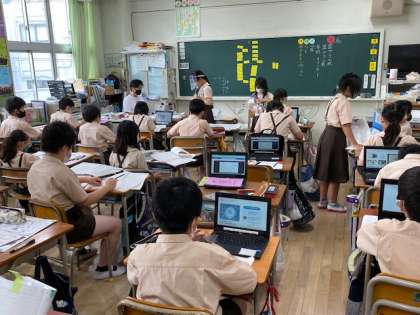 5年生1・2組の授業のようすです。1組は音楽で、自習をしながら一人ずつリコーダーのテストを行っています。2組は理科で、「ヒトのたんじょう」について、タブレット端末のTAEMSに出された課題について自習をしています。