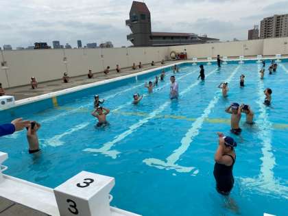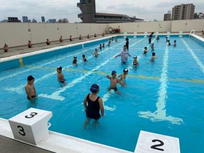 ウサギやゾウ、ペンギンのまねをして水の中を歩きます。