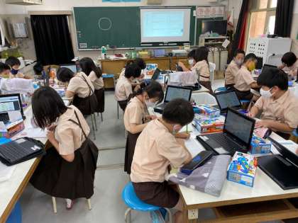 4年生1・2組の授業のようすです。1組は理科で、「乾電池の直列と並列のつなぎ方で電流が違うのか?」について自分の考えを書いています。2組は音楽のリコーダーを吹く前に、フェイスシールドを洗って用意しています。