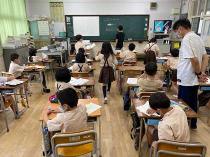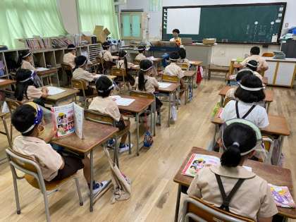 2年生1・2組の授業のようすです。1組は音楽で、マスクとフェイスシールドを着けて「メッセージ」という曲をみんなで歌っています。2組は生活科で、「ミニトマト」と「サツマイモ」の観察日記を台紙に貼る作業をしています。