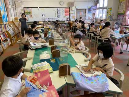 1年生1・2組の授業のようすです。1組は図書館で本を新しく借りて読んでいます。2組は算数で、「8−3のひき算」の学習をしています。