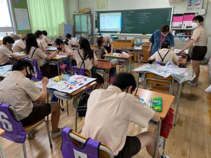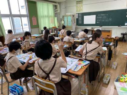6年生1・2組の授業のようすです。どちらも図工で、「ステンシル版画」を制作しています。