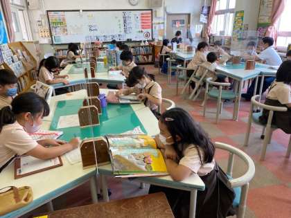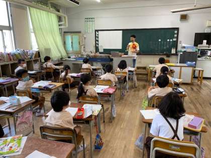 2年生1・2組の授業のようすです。1組は音楽ですが、授業の前に給食の牛乳パックについての注意をしています。2組は国語で、図書館を使って「言いつたえられている お話を知ろう」のプリントに取り組んでいます。