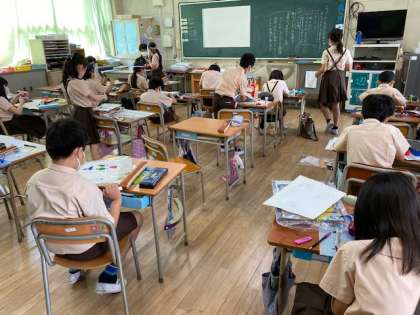 4年生1・2組の授業のようすです。1組は音楽で、自習をしながら一人ずつリコーダーのテストをしています。2組は図工で、「光のさしこむ絵」の制作に取り組んでいます。