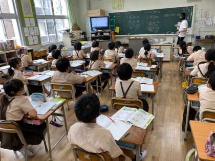 3年生1・2組の授業のようすです。どちらも算数で、1組は「2ケタと2ケタの足し算を工夫して暗算」する方法についての学習を、2組は計算ドリルをしています。