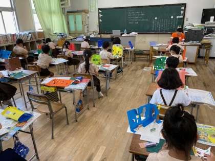 2年生1・2組の授業のようすです。どちらも図工で、「まどのある たてもの」を作っています。