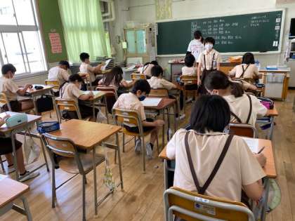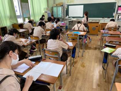 6年生1・2組の授業のようすです。どちらも算数で、個人別にドリルやプリントに取り組んでいます。