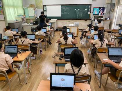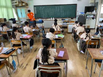 2年生1・2組の授業のようすです。どちらも算数で、1組は「まとめのテスト」に取り組んでおり、2組はタブレット端末を使って「デジタルプリント教材」を利用しよとしています。