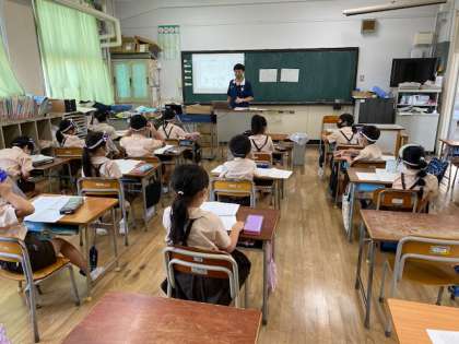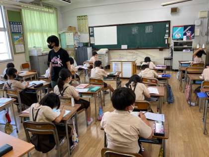 2年生1・2組の授業のようすです。どちらも国語で、1組は「いろんな おとの あめ」を音読し、2組は「強」・「後」の漢字の練習をしています。