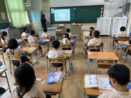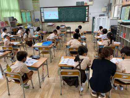 1年生1・2組の授業のようすです。どちらも算数で、「10よりおおきいかず」を算数ブロックを使ったりしながら「10」と「いくつ」になるか考えています。