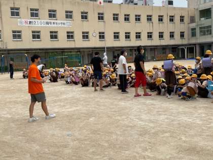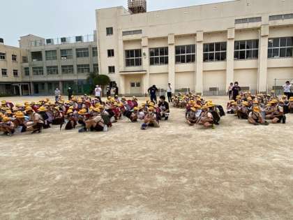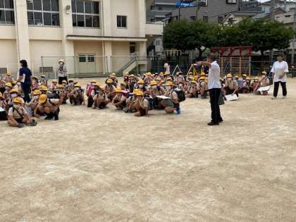 本日5時間目、「大阪市に暴風警報が発令された」との設定で、避難訓練を行いました。6年生を先頭に地域別に集合しました。