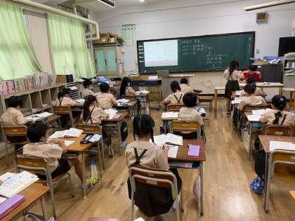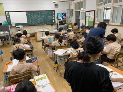 2年生1・2組の授業のようすです。どちらも算数で、教科書の「2ケタの足し算のひっ算」の練習問題に取り組んでいます。
