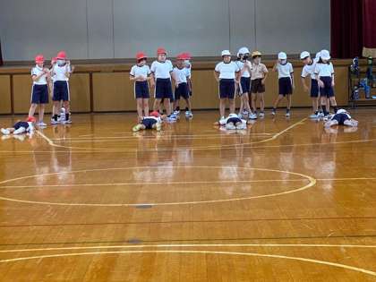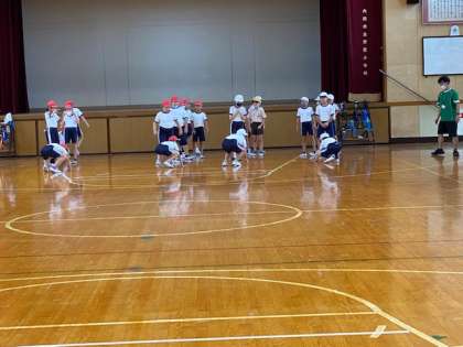 4年生1・2組の授業のようすです。どちらも体育で、1組はビデオ教材で「速く走る」ための学習をしており、2組は体育館で、うつ伏せで寝た状態から起き上がって走る練習をしています。