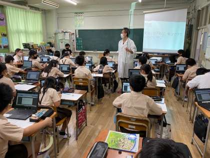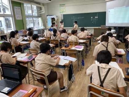 5年生1・2組の授業のようすです。1組は理科で、タブレット端末を使って「花の受粉」について学習をしています。2組は自習をしながら、フェイスシールドを着けて一人ずつリコーダーのテストを行っています。