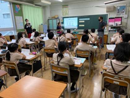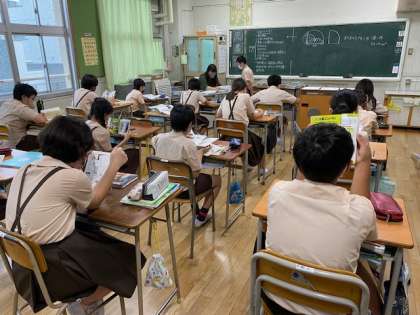 6年生1・2組の授業のようすです。1組は英語で、先週に引き続き「My Summer Vacation」の単元で「What did you do in summer?」の問いに対して、「I went to the sea.」「I enjoyed swimming.」等の文章を完成させていく学習をしています。2組は図書の時間で、図書館で本を借りて来て読んでいます。