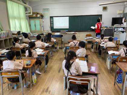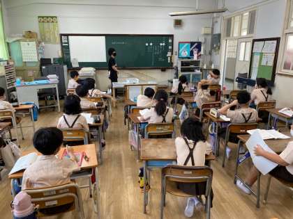 2年生1・2組の授業のようすです。どちらも国語で、「うれしくなる ことばを あつめよう」の単元の学習をしています。