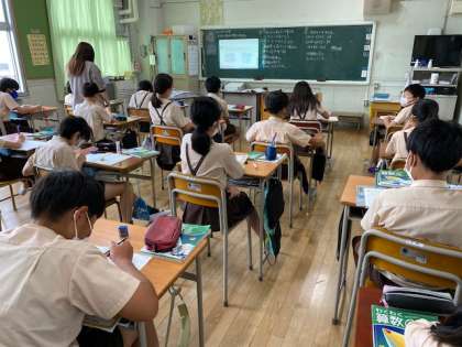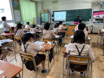 6年生1・2組の授業のようすです。どちらも算数で、昨日に引き続き、直方体や三角柱などの「立体の体積の求め方」の学習をしています。