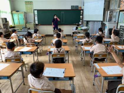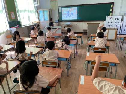 1年生1・2組の授業のようすです。1組は運動会に向けて「EX体操」のビデオを観ています。2組は書写で、硬筆でひらがなの文を書く練習をしています。