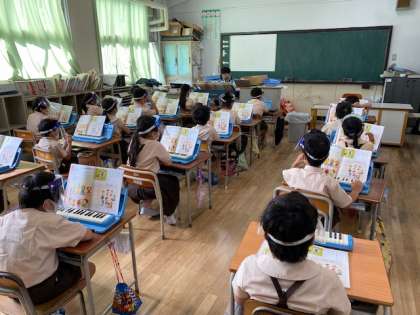 2年生1・2組の授業のようすです。どちらも音楽で、1組は「小犬のビンゴ」「ロンドン橋」の歌をフェイスシールドを着けて歌っています。2組は「みんなで いっしょに あかるい こえで うたいましょう」の歌をCDで聴いています。