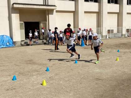 5年生1・2組の授業のようすです。合同体育で、体育館でフリスビーを使ったゲームをしながら、運動場でトラック1周のタイムを測定しています。