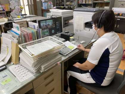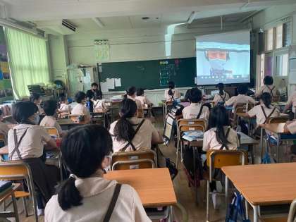 本日朝、児童朝会がありました。TEAMSを使って、職員室のパソコンの前で話しているところを各教室のプロジェクターで表示してもらいました。