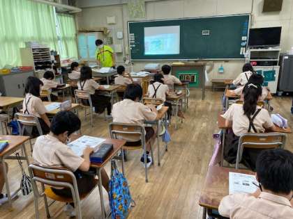 4年生1・2組の授業のようすです。どちらも社会で、1組は「自然災害から命とくらしを守る」の単元の小テストを、2組は「同単元」の学習をしています。