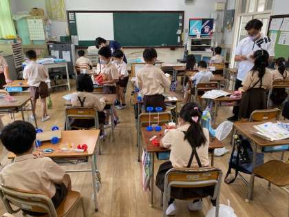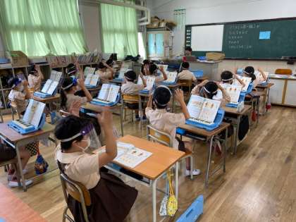 2年生1・2組の授業のようすです。1組は音楽で、「2びょうしを かんじながら うたいましょう」で「はしの うえで」の歌をフェイスシールドを着けて歌っています。2組は生活科で、段ボールや紙パックを使って車を作っています。