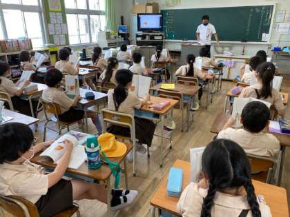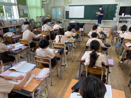 3年生1・2組の授業のようすです。どちらも国語で、「サーカスのライオン」を音読したりしています。