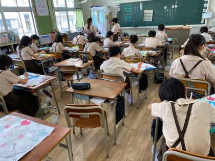 5年生1・2組の授業のようすです。どちらも図工で、「平和ポスター」を制作しています。