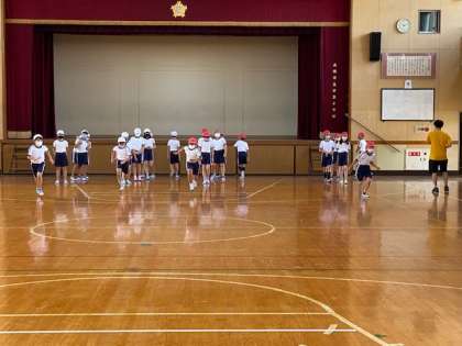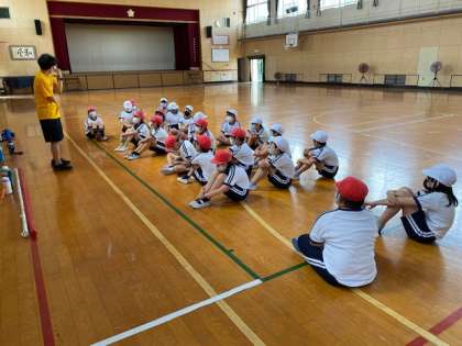 4年生1・2組の授業のようすです。どちらも体育で、1組はビデオ教材でボールを投げる運動の学習をしています。2組は体育館で、短距離を走る練習をしています。
