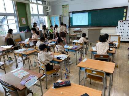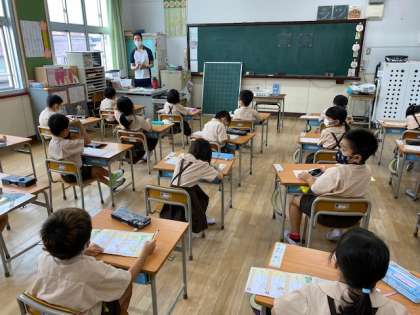 1年生1・2組の授業のようすです。どちらも書写で、硬筆で「漢数字」を書く練習をしています。できた人からチェックを受けています。