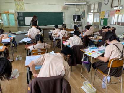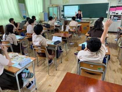 6年生1・2組の授業のようすです。1組は英語で、「I play 〜」「I like 〜」の「〜」の部分に単語を入れて完成させて答える練習をしています。2組は図工の時間で、「平和ポスター」を完成させています。