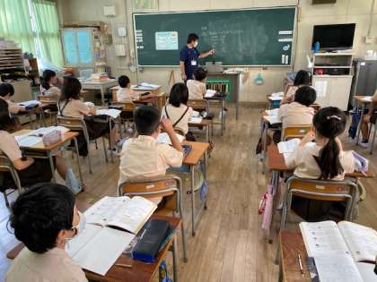 4年生1・2組の授業のようすです。1組は算数で、「9000÷150」の計算の工夫について考えています。2組は理科で、「とじこめた水と空気を同時におすと、どうなるのだろうか。」について考えて意見をノートに書いています。