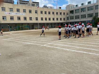 5年生1・2組の授業のようすです。合同体育で、運動会の個人走や団体競技の入退場等の練習をしています。
