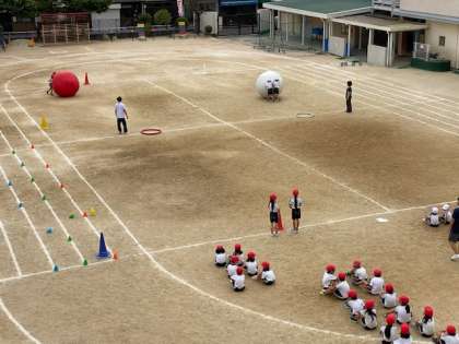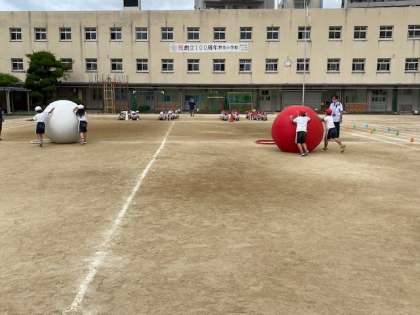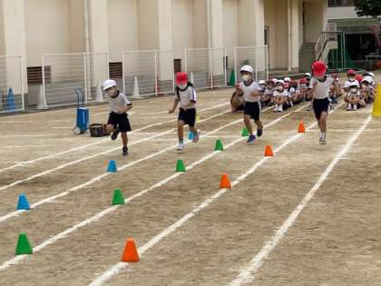 2年生1・2組の授業のようすです。合同体育で、運動会に向けて「個人走」や「団体競技」の練習をしています。