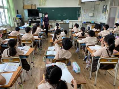 3年生1・2組の授業のようすです。どちらも算数で、1組は「たんいの関係」の単元の学習をしています。2組は教科書の復習問題をノートに解いています。