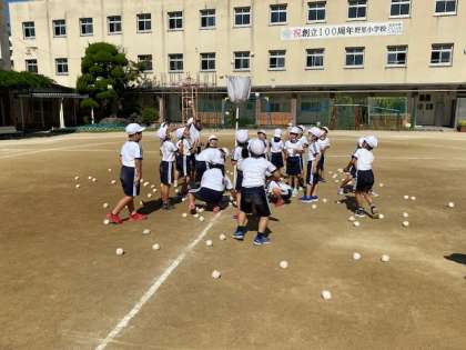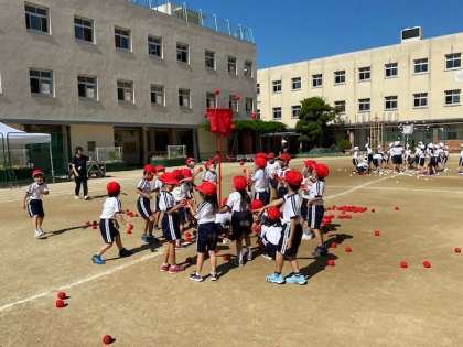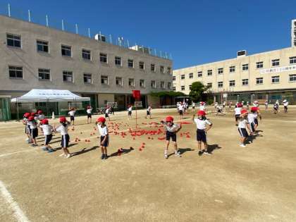学年競技「かごまでとどけ!」のようすです。ダンスも一部取り入れています。