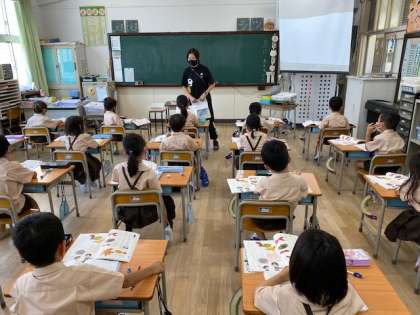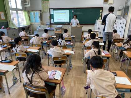 1年生1・2組の授業のようすです。1組は算数で、「あわせてへるとき、いくつになるかをかんがえよう」の学習をしています。2組は国語で、「なにに 見えるかな」の単元でいろいろな形や色の葉っぱや木の実を並べて見ています。