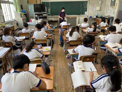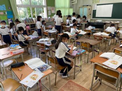 3年生1・2組の授業のようすです。どちらも国語で、「想像を広げて物語を書こう」の単元の学習で、自分で設定を考えてプリントに書いています。