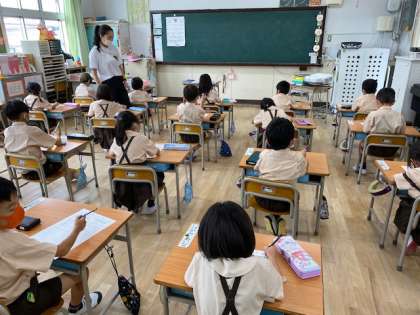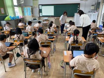 1年生1・2組の授業のようすです。1組は生活科で、タブレット端末を使って「デジタルドリル NAVIMA」にログインする練習をしています。2組は算数で、「つづいたたし算・ひき算」の単元のテストをしています。
