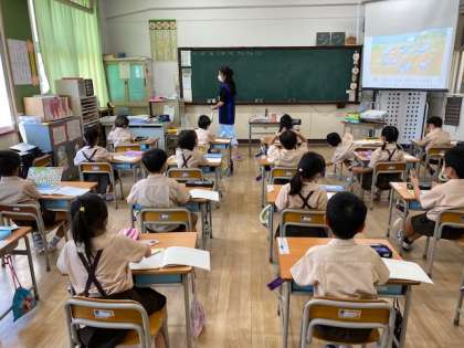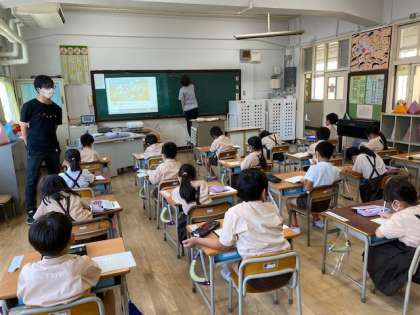 1年生1・2組の授業のようすです。どちらも算数で、「8+3」のように「くり上がりのあるたし算」の学習をしています。