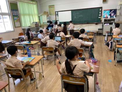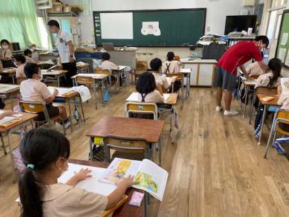 2年生1・2組の授業のようすです。どちらも図工で、1組は教科書等から好きな絵を選んで書いています。2組は透明なシートに絵を描いて切り取る作業をしています。