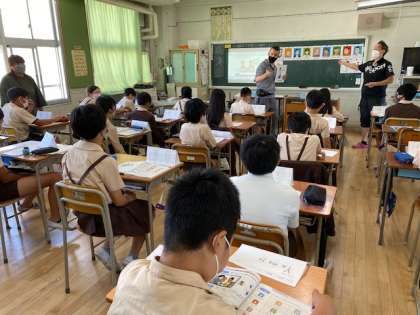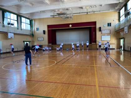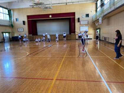 6年生1・2組の授業のようすです。1組は体育で、ラダーを使ってリズミカルな運動をしています。2組は英語で、「人の職業や性格などを紹介しよう」のテーマで、「She is kind and gentle.」のチャントや「有名人の人物当てクイズ」をしています。