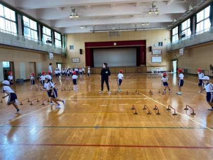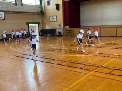 1年生1・2組の授業のようすです。合同体育で、ラダーやミニハードルを使っての跳んだりする運動をしています。